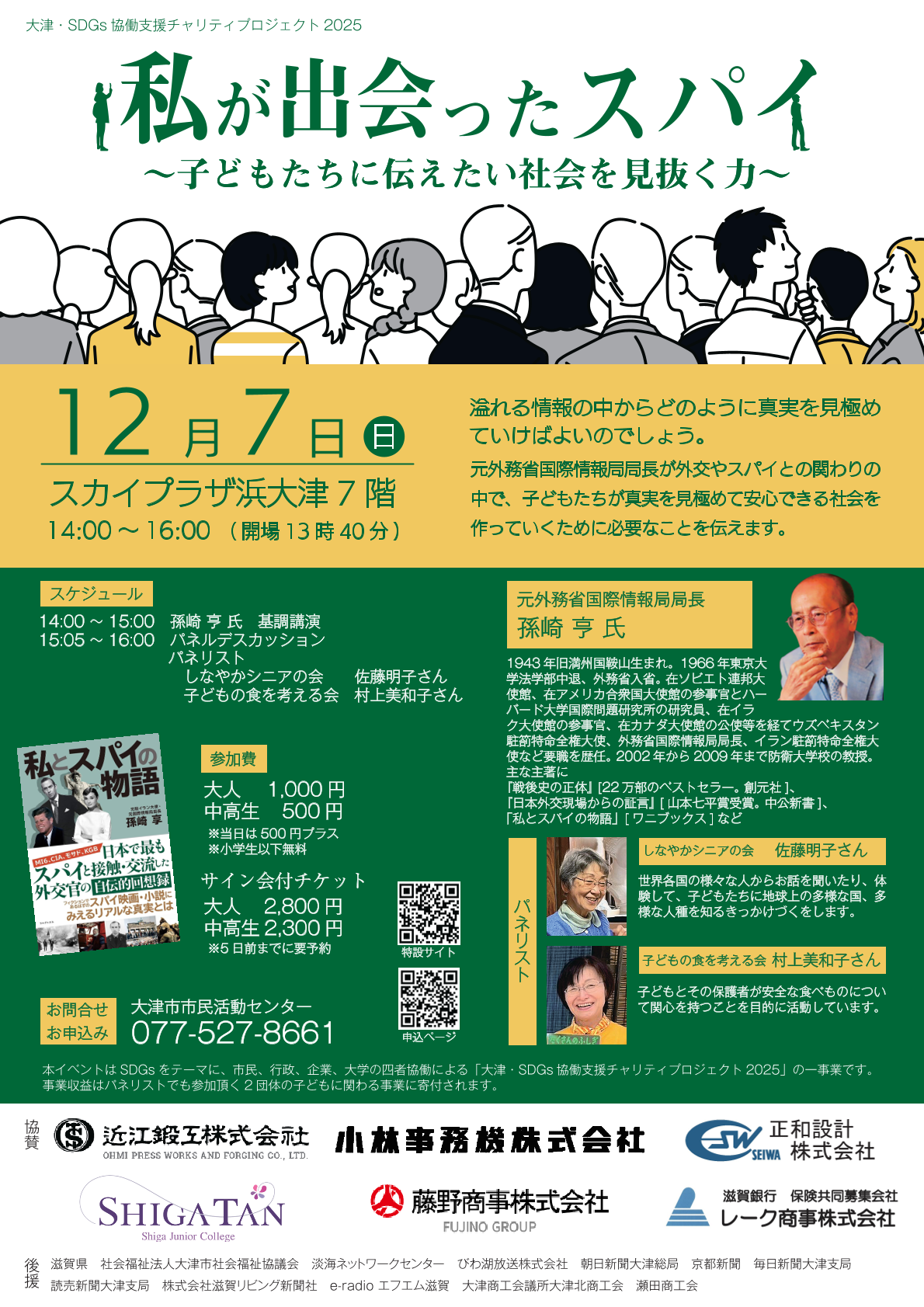 「大津・SDGs協働支援チャリティプロジェクト2025」の人材育成プログラムです。本フォーラムでは、元外務省国際情報局局長の孫崎 享 氏の基調講演と大津市内でSDGsの考え方を示す5つの「P」のうち3つ以上の「P」を活動目的にしている団体(大津・SDGs協働支援チャリティプロジェクト2025支援先団体)を交えたパネルディスカッションで、その方策について知見を交わします。情報社会で正しい情報を見極めるにはどうすればいいのか⁉是非お越しください。私が出会ったスパイ〜子どもたちに伝えたい社会を見抜く力〜