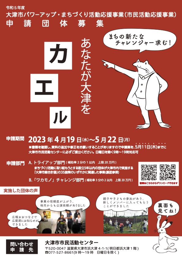 ※まず申請案を、2023年5月11日(水)までに大津市市民活動センターにご提出ください。センターにおいて提出書類を確認の上、不備等ありましたらご連絡します。